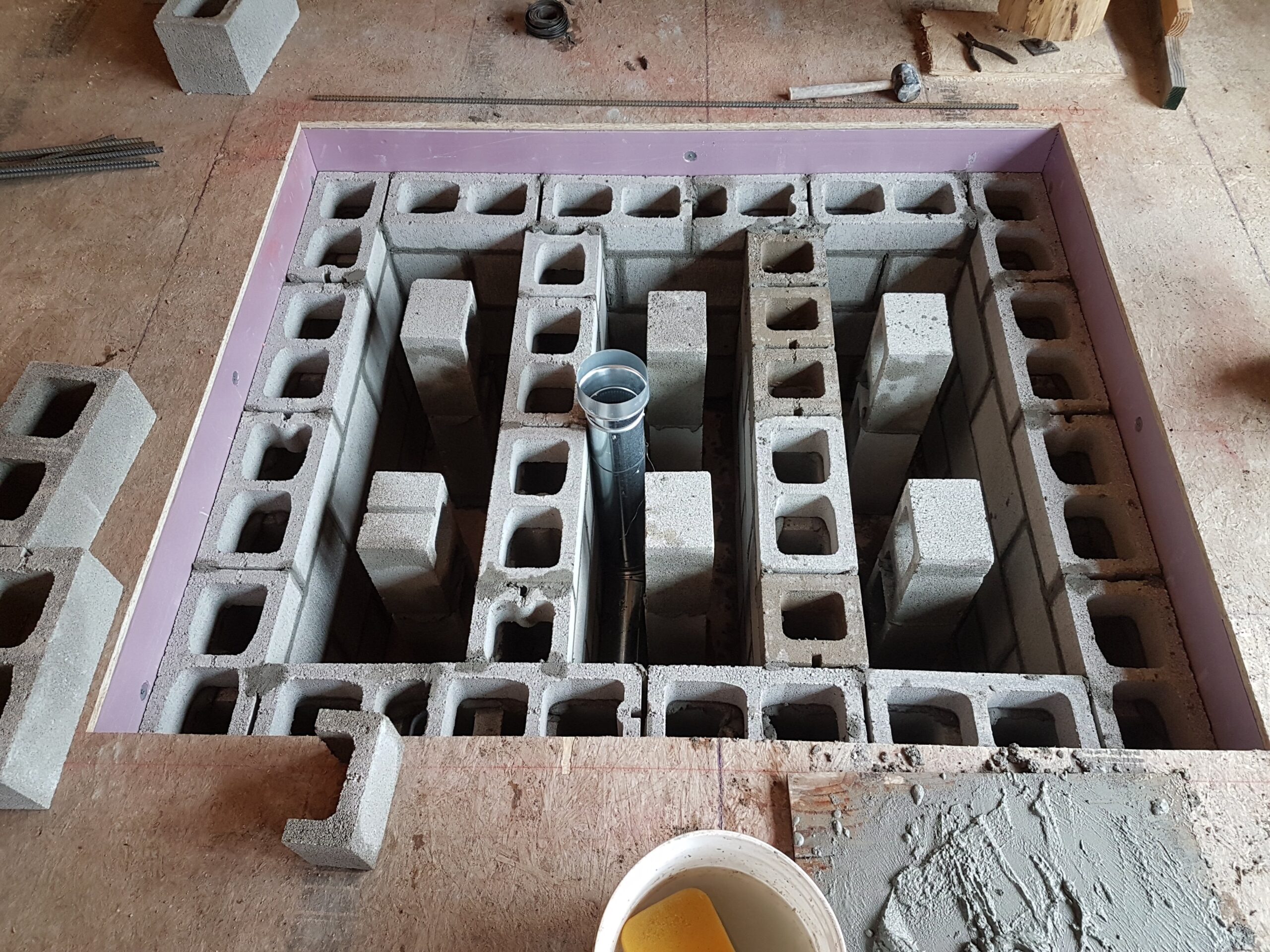 Here is an example of a foundation for a masonry heater being constructed with outside air being plumbed: