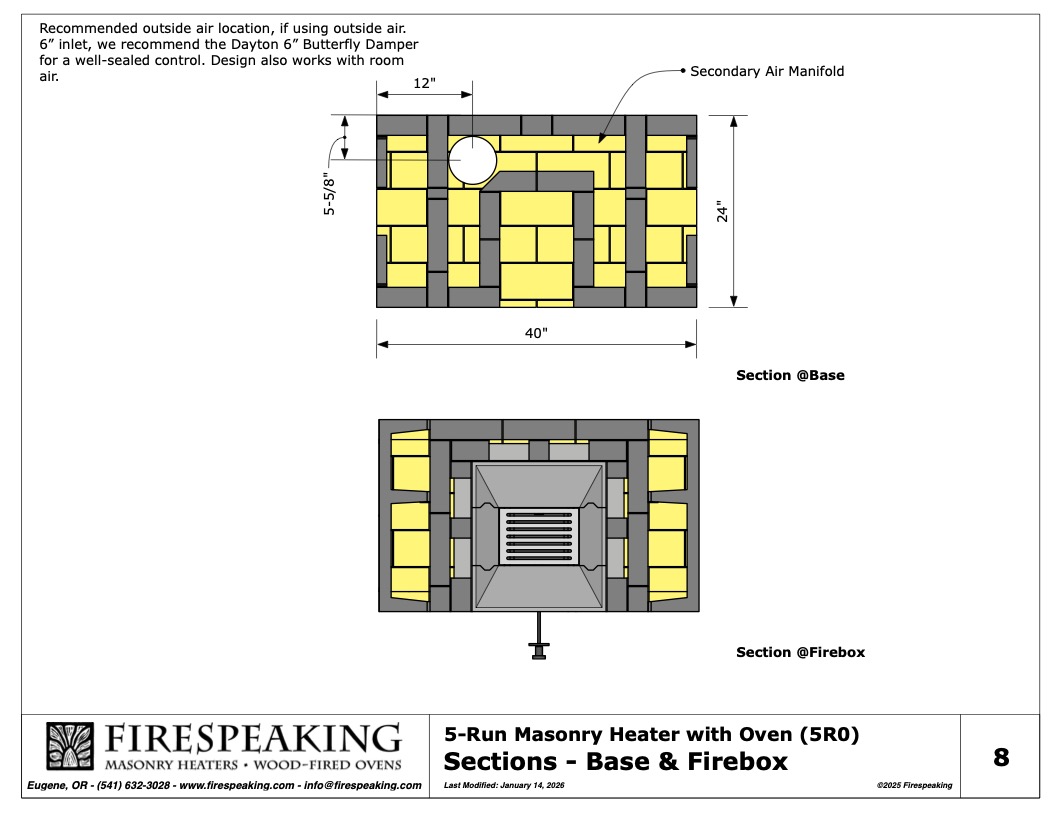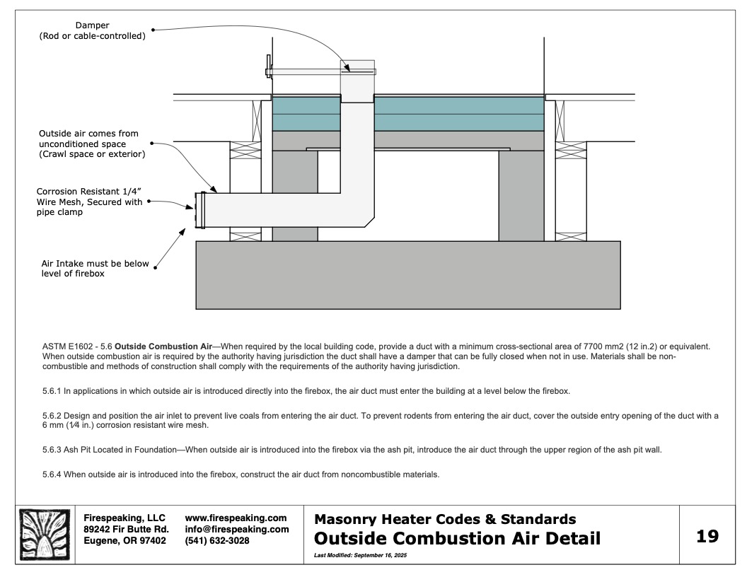 Providing outside or “make-up” air directly to a masonry heater is a modern technique to ensure that the firebox receives the air it needs for efficient combustion and does not compete with other appliances such as kitchen exhaust hoods for adequate venting.