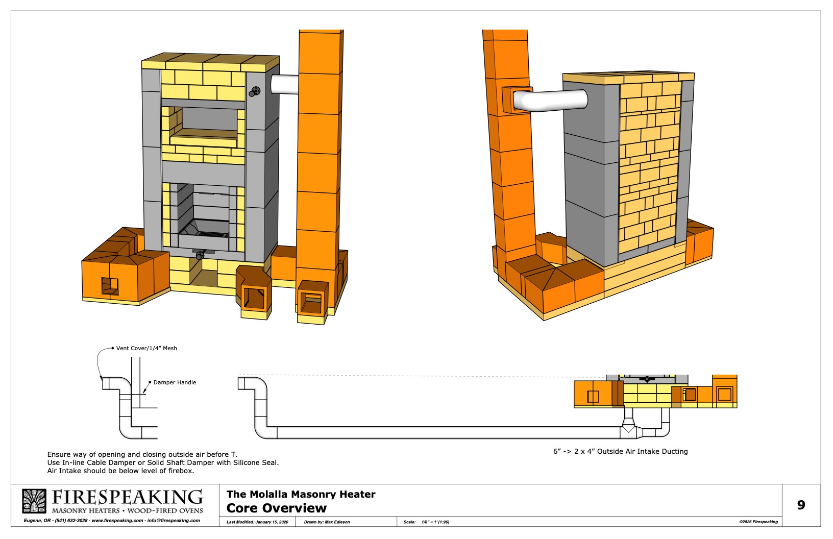 This article complements the Masonry Heater Foundation Details article by providing real-world process examples. All framing is placed 2″ beyond the heater footprint to meet clearance requirement. Only the subfloor bridges across that clearance (since it is a membrane that can dissipate heat and is necessary practically in construction). Although pink board was used in […]