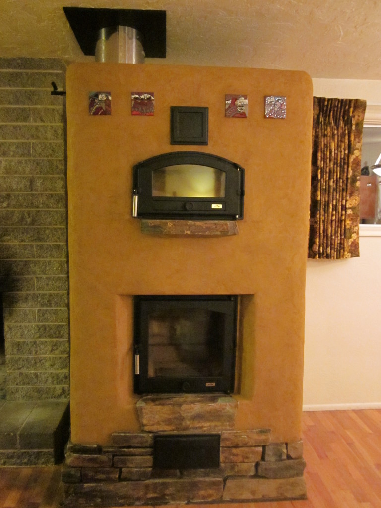 This masonry heater has a simple compact design and includes a bake oven. The technical core is built with firebrick and the heat receiving outer shell is made of compressed earth blocks. Natural ledge stone was used at the base, an earthen plaster was applied as a finish and we installed tiles that were meaningful gifts to the homeowners. This heater represents a good example of Firespeaking’s ethic: providing warmth and function while using locally harvested materials and completing the project within an affordable budget.